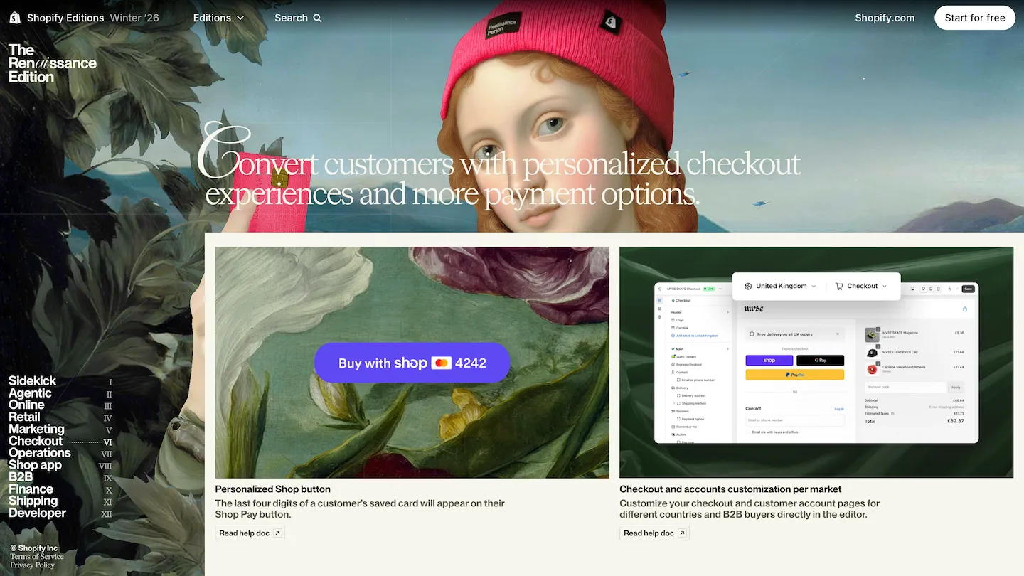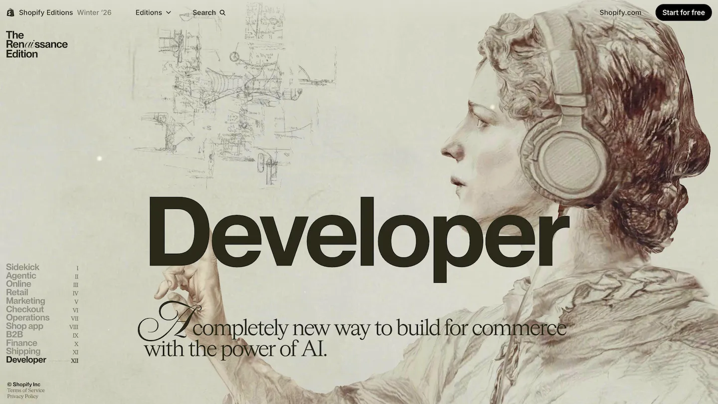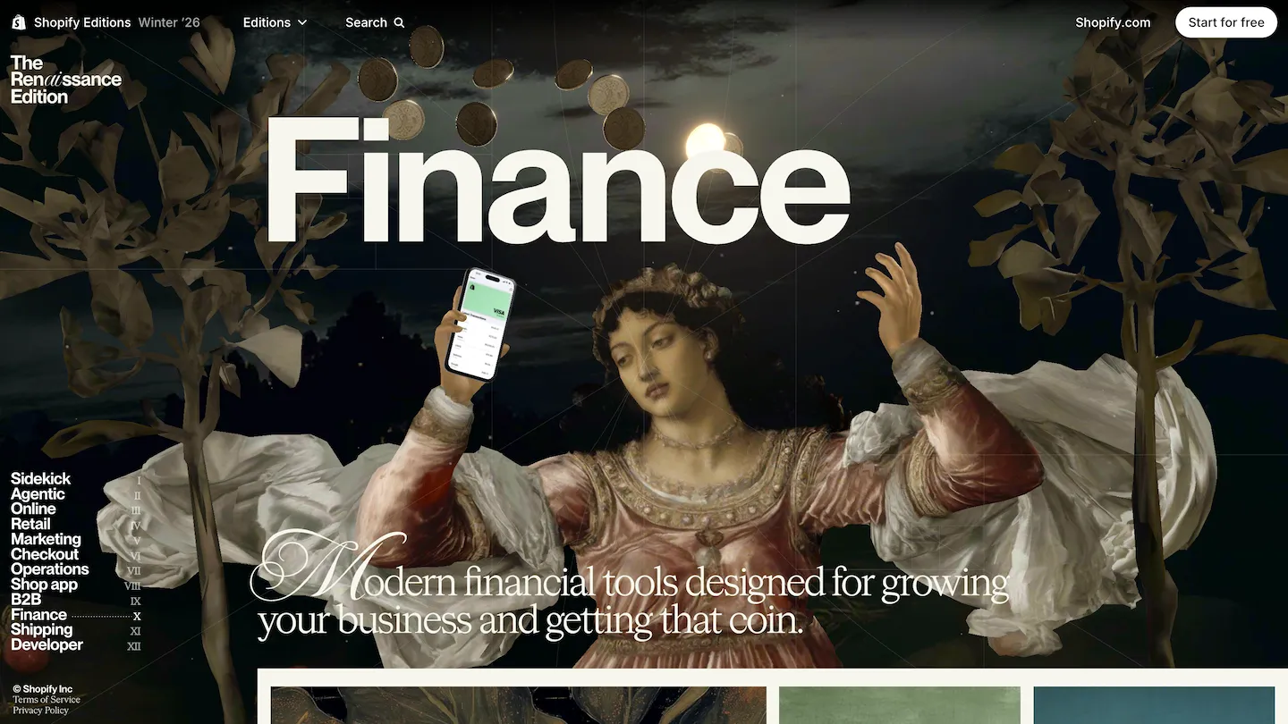 온라인 쇼핑몰 구축 플랫폼인 쇼피파이(Shopify)는 지난 2022년 여름부터 6개월마다 업데이트 노트 성격의 에디션 웹페이지를 발표해 오고 있어요. 매 에디션마다 뚜렷하고 개성 있는 컨셉으로 대규모 업데이트 내용을 소개하고 있는데요, 이번 2026년 겨울 에디션은 르네상스를 주제로, 인터랙티브 요소가 가득한 웹페이지를 공개했습니다.