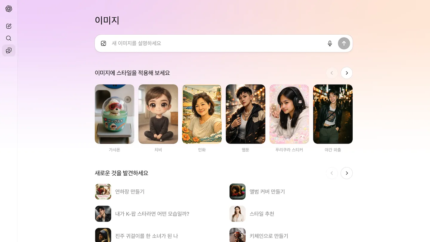 또한 이번 업데이트에서는 이미지 전용 페이지를 신설하기도 했는데요, 사전 설정 스타일(Preset Style)을 함께 소개하고 있어 챗GPT에서 어떤 이미지 작업을 할 수 있는지를 자연스럽게 보여주며 사용을 유도하고 있습니다.