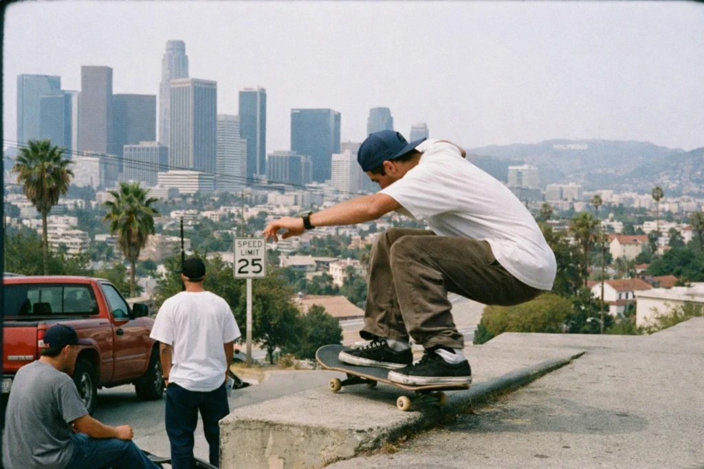 왼쪽은 챗GPT의 신규 이미지 모델로 생성한 90년대 필름 카메라 스타일의 이미지입니다. 오른쪽 이미지는 왼쪽 이미지를 기반으로 모자와 티셔츠 색상 변경, 요소 제거/추가, 표지판의 텍스트 수정 등 많은 작업이 자연스럽게 일관성을 유지하며 반영된 모습이에요.