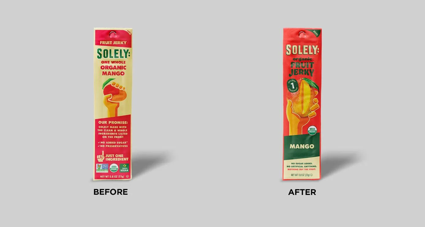 과일 스낵 브랜드 Solely는 과일, 그 자체(Nothing but the fruit)라는 메시지에 집중해 패키지 리뉴얼을 진행했어요. 기존 패키지는 과일의 이미지보다는 텍스트 정보와 복잡한 인증 마크의 비중이 높았거든요.