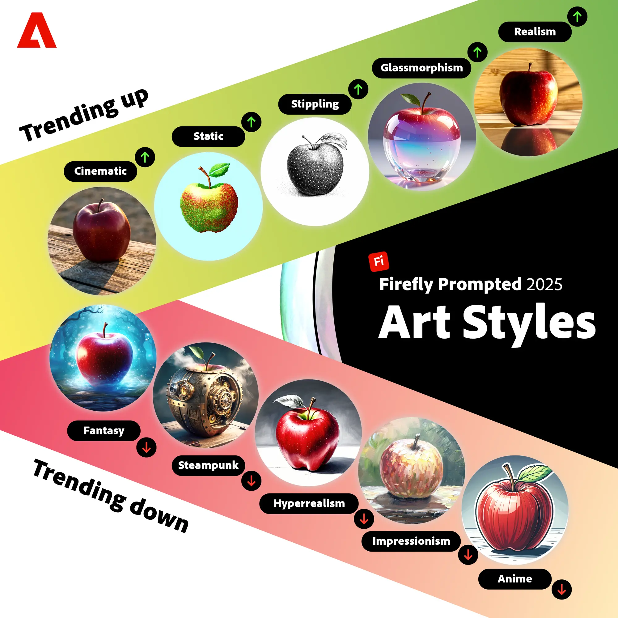 어도비에서 공유한 모든 2025년 프롬프트 트렌드 내용은 아래의 원문에서 확인해 주세요. 모든 분야가 디자인과 밀접한 건 아니지만, 인기 프롬프트 키워드를 통해 문화적, 정서적 트렌드도 함께 파악할 수 있어요.