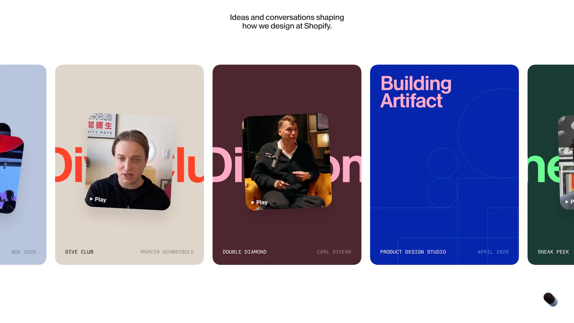 페이지는 크게 3가지 섹션으로 나뉘어져 있습니다. 첫 번째 섹션은 쇼피파이의 주요 디자인 작업을 보여주는 영역입니다. 이 섹션에서 보여주는 디자인은 내부 도구인 Artifact와 연결되어 있는데요, Artifact는 쇼피파이 조직 내부에 흩어져 있는 디자인 작업을 구조화해 관리하고 공유하기 위해 만든 도구입니다.