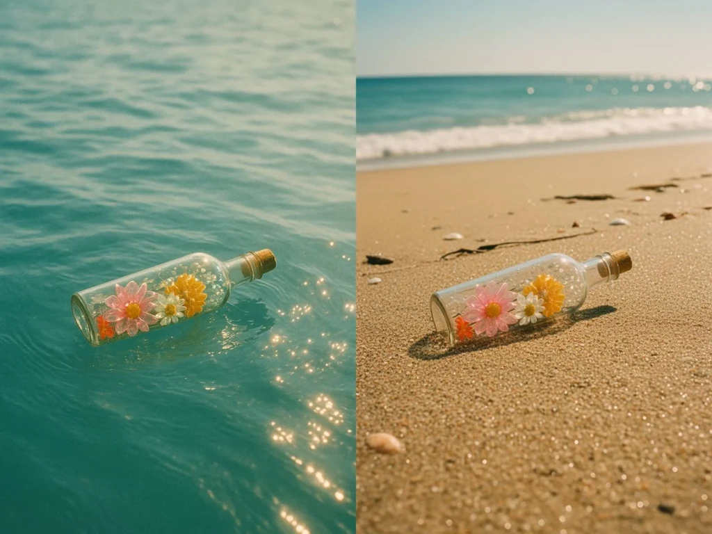 왼쪽은 얼마 전 레이디러너가 연휴 동안 재미 삼아 만든 이미지입니다. (인스타그램에서 해당 이미지 작업 과정과 영상화된 결과물까지 보실 수 있어요.) 이번에는 물에 떠 있던 유리병이 해변에 도착한 모습으로 바꿔 달라고 요청해 보았습니다.