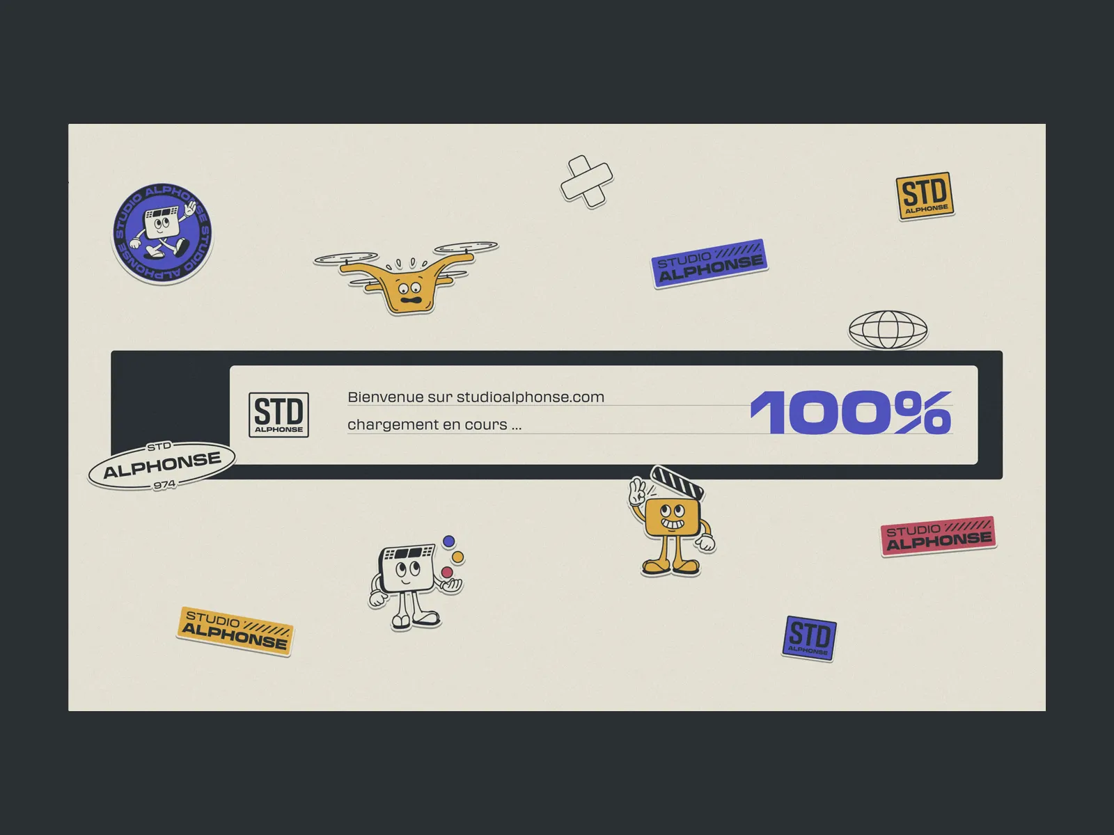 비디오 프로덕션 기업 Studio Alphonse의 웹사이트 로딩 화면입니다. 미니멀하게 표현된 VHS의 측면 비주얼과 함께 스티커 콜라주를 연출해서 레트로 분위기를 더욱 살리고 있어요. 스티커가 메인 디자인 요소라기보다는 일러스트를 스티커 형태로 연출해서 포인트로 활용한 방식입니다.