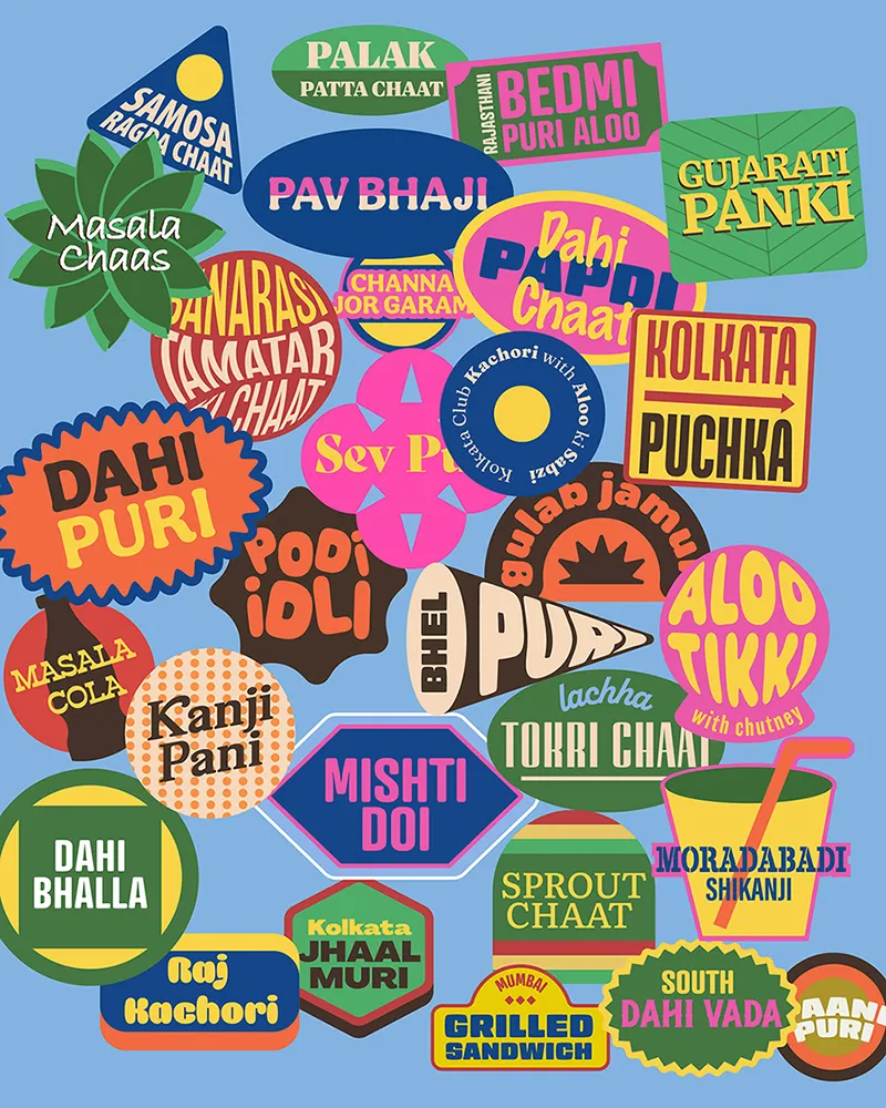 인도의 스트릿 푸드 브랜드 Chaatery의 브랜딩 디자인도 다양성이라는 핵심 키워드를 표현하기 위한 수단으로 스티커를 선택했습니다. 스트릿 푸드가 가진 생동감과, 이 브랜드의 핵심 메뉴인 차트(chaat)가 지역마다 맛, 스타일, 조합 방식이 미묘하게 다르다는 점을 담으려고 한 거죠. 디자인에 다뤄야 할 내용이 많을 때는 이렇게 스티커 콜라주 스타일을 떠올려보세요!