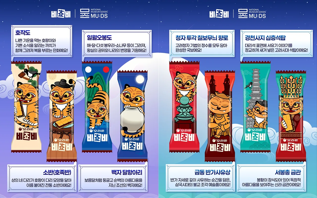 비쵸비 국립중앙박물관 에디션 패키지에는 케데헌의 캐릭터 더피와 서씨의 모티브가 되어준 호작도 속 호랑이와 까치가 메인으로 등장하고, 우리나라의 보물 8종을 재해석한 일러스트레이션이 함께 담겨있어요. 좁고 긴 형태의 패키지인데도 각 보물의 특성을 명확하게 잘 보여주고 있지 않나요? 금동 반가사유상 버전에서는 호랑이 캐릭터 자체가 반가사유상으로 표현된 점이 특히 재미있네요.
